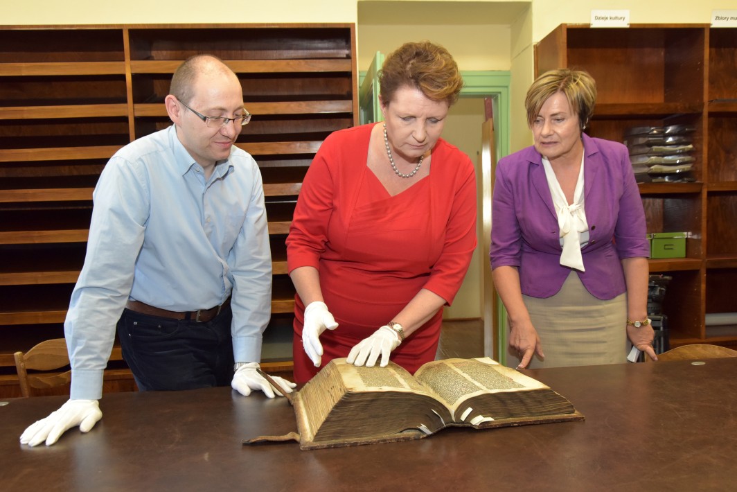 Przekazanie rękopisu M 1538. Na zdjęciu od lewej Pani Grażyna Piotrowicz, Dyrektor BUWr; Pan Tomasz Śliwiński z Departamentu Restytucji Dóbr Kultury w MKiDN; Pani Elżbieta Rogowska z Ministerstwa Kultury i Dziedzictwa Narodowego, Dyrektor Departamentu Restytucji Dóbr Kultury.[Kalendarium] |